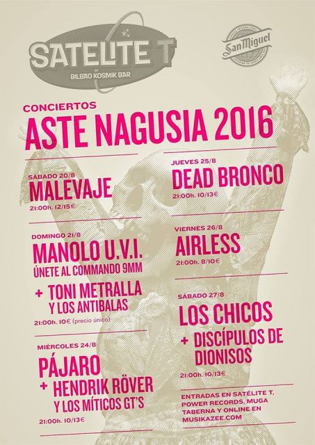 Cada año cuando se acerca la semana grande de Bilbao los rockeros nos frotamos las manos esperando los anuncios de los conciertos que va a programar el Ayuntamiento, si bien es cierto que, año tras año, esa ilusión se ha ido desviando hacia la programación de otros eventos. Lejos quedan los tiempos en que, según cuentan los más viejos del lugar, Marijaia alzaba sus brazos al ritmo de canciones de Iggy Pop o Turbonegro en conciertos multitudinarios y gratuitos programados por el consistorio bilbaíno. Ahora los platos fuertes del programa municipal son Astenagusidance, grupos de indipop patrio de esos que tocan en festivales veraniegos repartidos por toda la piel de toro… y demos gracias a que este año no han venido ni las jodidas Nancys Rubias ni Fangoria!!!