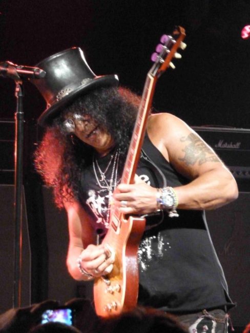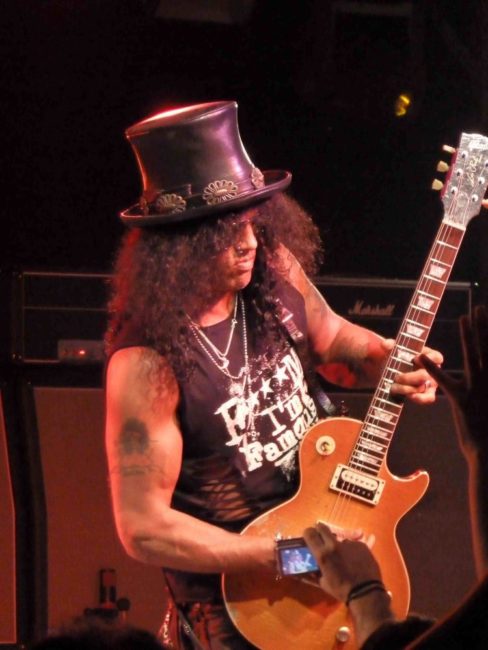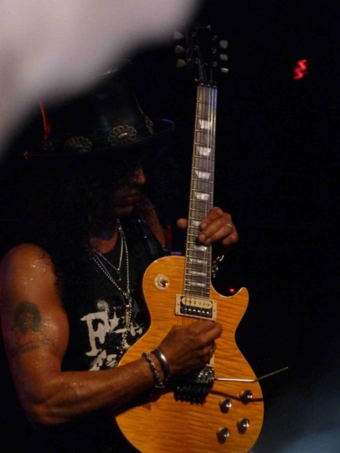Volvamos al show de la Rockstar. Lo que allí pudimos ver fue ni más ni menos que lo que esperábamos, una banda entera tocando por y para Slash, mientras éste disfrutaba como un niño tocando riff tras riff y solo tras solo. Casi siempre estuvo con su Les Paul al hombro, que sólo se quitó para colgarse una Gibson Explorer negra cuando necesitó sonar más metalero. El equipo básico de este hombre ya lo conocemos todos: Les Paul Standard, ampli Marshall AFD100 Slash signature con pantallas 4×12 con un precioso logotipo en el que se puede apreciar la figura de una chica con chistera abierta de piernas, y wah wah Dunlop SW-95 Slash signature, con un extra de ganancia para los solos.