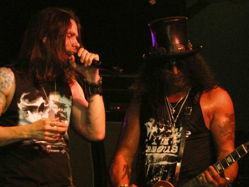 La banda que le acompaña en esta gira suena supercompacta. Tal vez el que pase más desapercibido sea el segundo guitarra,Bobby Schneck, del que hablaremos más adelante. El bajista, Todd Kerns, es un tío que derrocha carisma y simpatía, con un estilo algo menos punk que el de Duff, pero también muy sleazy. Además canta genial. Las segundas voces que le hizo de apoyo a Myles fueron estupendas, e incluso se permitió el lujo de cantar una canción. Aquí quiero hacer un inciso. Tras verles en Barakaldo el día 17 de julio, les pude ver de nuevo 5 días más tare en el High Voltage Festival de Londres, y me parece digno de mención el hecho no sólo de que variasen parte del repertorio, sino que incluso el bajista volvió a cantar una canción, pero en este caso fue otra distinta! (en Barakaldo hizo “We’re All Gonna Die” mientras que el Londres cantó “Doctor Alibi”, ambas del último LP de Slash). El batería, Brent Fitz, estuvo en su sitio, con una gran pegada y un muy buen tempo, haciendo en todo momento lo que requerían las canciones. Todos sabemos que las canciones míticas de los gunners tienen partes de batería muy “marca de la casa” (véase como ejemplos “Nightrain” o “Rocket Queen”), y éstas sonaron clavadas a las originales, lo cual es de agradecer, ya queeso era exactamente lo que los fan queríamos oír. Y qué decir de la voz de Myles Kennedy. Confieso que aún no le he prestado atención a Alter Bridge, pero sólo viendo lo que ha hecho con Slash, tanto en estudio como en directo, este tío se merece todo mi respeto. A nivel de carisma, por supuesto, no le llega a Axl ni a la suela de los zapatos, pero con su forma de cantar se le puede perdonar ese detalle.