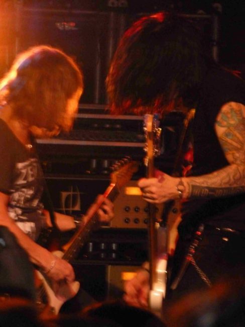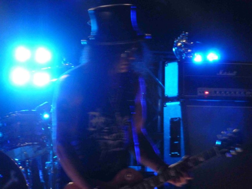 Y si además se rodea de una banda como la que le acompaña en esta gira , tenemos el espectáculo asegurado. Con un show de poco más de 2 horas centrado en los clásicos de Guns and Roses y en los temas de su último disco en solitario, nada podía fallar. He de admitir que tal vez no sea todo lo imparcial que debería con este hombre. Partimos de la base de que, en mi opinión, “Appetite for Destruction” es uno de los mejores discos de la historia del rock, y tanto el “Lies” como los “Illusions” me parecen una pasada. Y desde que el Dr. Frankensguitar me descubrió el año pasado el último disco de Slash en solitario, ha sido uno de los discos que más he escuchado en los últimos meses, máxime después de ver el gran show que ofreció en el Azkena Rock Festival de 2010, donde estuvo prácticamente a la altura de los mismísimos KISS, que actuaron ese día a continuación. Es cierto que el disco tiene un sonido muy metalero en comparación con los G’N’R clásicos, que tenían un sonido de guitarras mucho más setentero, pero es un disco con una producción perfecta, donde se escucha hasta el mínimo detalle, y donde cada cosa está en su sitio. Además, las canciones son en general bastante buenas, manteniendo casi todas ellas un nivel compositivo muy alto, y el contar con voces como las de Lemmy, Andrew Stockdale, Ozzy o el propio Myles Kennedy le da un plus extra a este LP. Incluso Fergie de “the Black Eyed Peas” suena cañón!